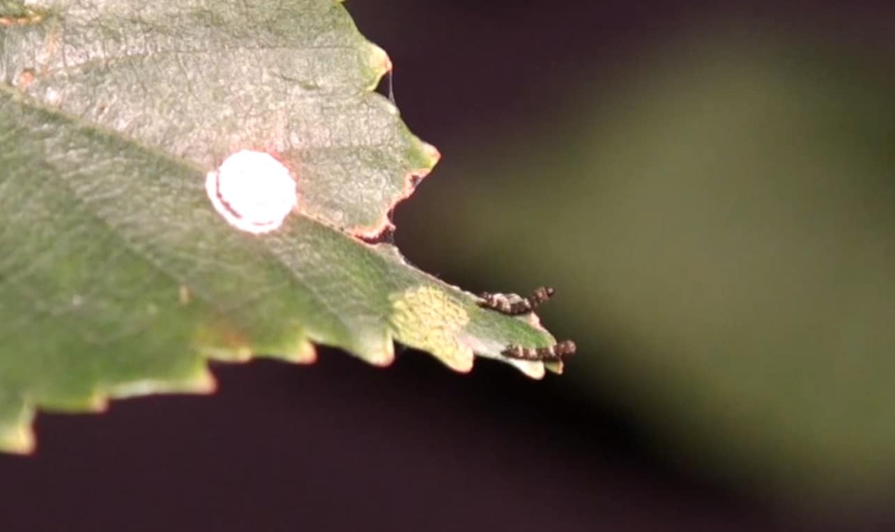 Новорожденные гусеницы длиной всего 2 мм сразу направляются к краю листа березы бумажной (Betula papyrifera), превращая его в свой «замок». Вместо группового выживания они выбирают одиночество, плетя шелковые коврики для безопасного перехода в стадию куколки. Это первый шаг их удивительной стратегии!