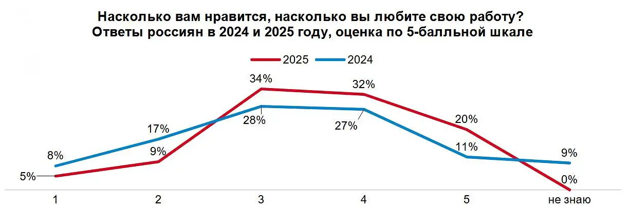 Средняя оценка удовлетворённости работой выросла до 3,5 баллов из 5 против 3,2 в 2024 году. Особенно радует пятикратный рост числа счастливчиков: если год назад лишь 11% ставили высший балл своей деятельности, то сейчас таких уже 20%.