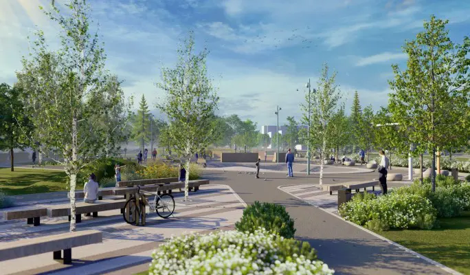 Рядом со станцией метро «Физтех» планируют создать скейт-парк, пешеходную аллею и площадки с современным оборудованием. Территорию украсят цветники, газоны, дизайнерские скамейки и стильные навесы. Основной этап работ завершится к открытию станции.