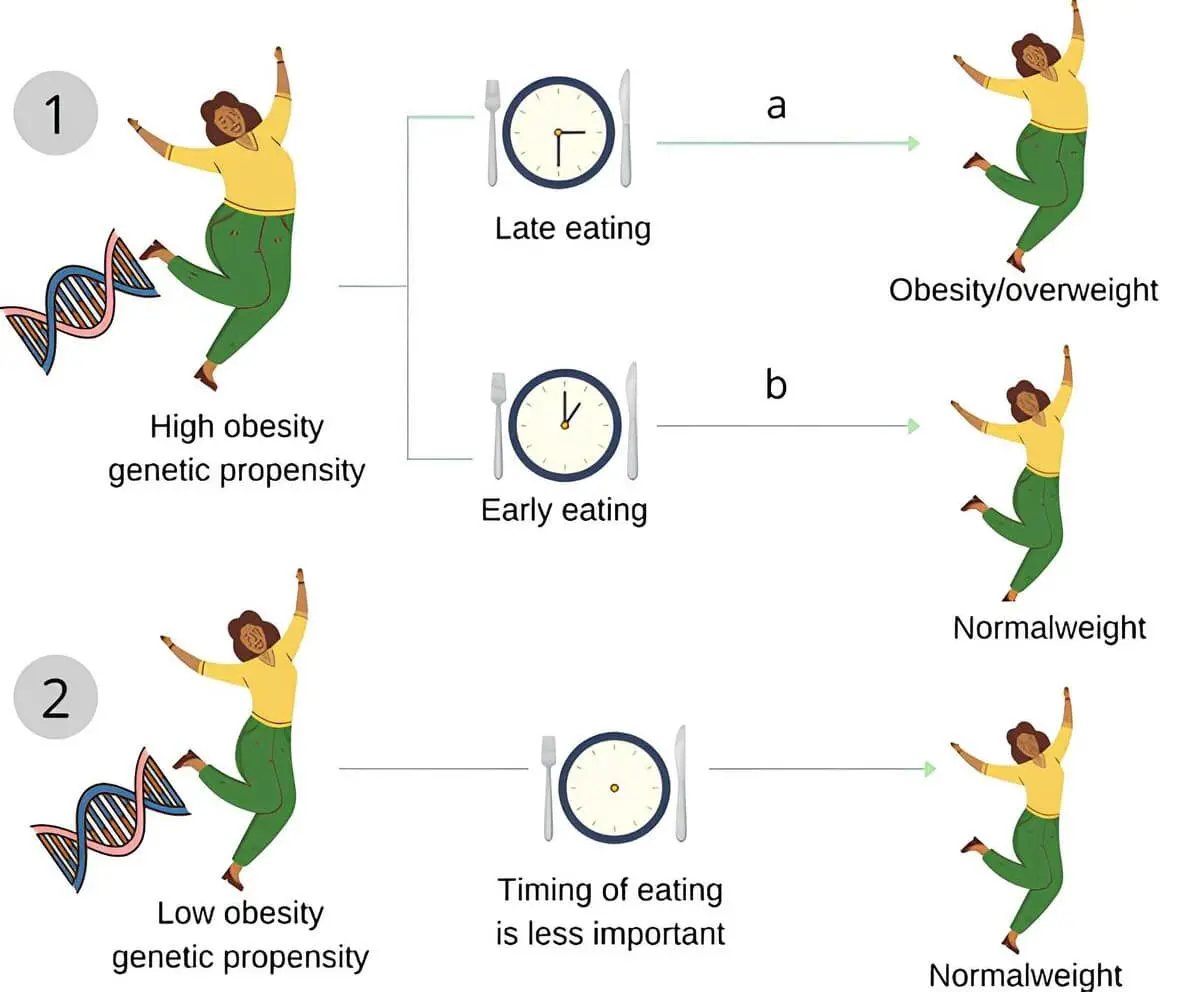 На основе анализа 900 492 генетических маркеров для каждого участника рассчитали полигенный риск ИМТ. Среднее время приёма пищи определялось как середина между завтраком (08:28), обедом (14:33) и ужином (21:20), составляя 14:54. Каждый час смещения трапезы на более позднее время коррелировал со снижением скорости похудения на 46 г/неделю, ростом исходного ИМТ на 0,952 пункта и увеличением веса на 2,2% спустя 12 лет. Лишь 23,9% участников сохранили результат в долгосрочной перспективе.