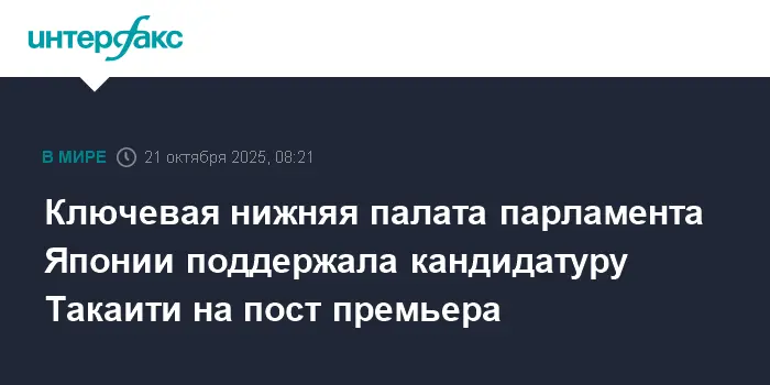 Ключевая нижняя палата парламента Японии одобрила большинством голосов кандидатуру Санаэ Такаити, председателя правящей Либерально-демократической партии (ЛДП), на пост 104-го премьер-министра страны.