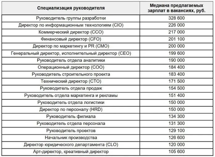 Вторую строчку рейтинга занимают директора по информационным технологиям (медиана 226 000 руб.), третью – коммерческие директора (217 000 руб.). В десятку лидеров также вошли финансовые директора (201 100 руб.), директора по маркетингу и PR (200 000 руб.), руководители отделов аналитики (190 000 руб.), операционные директора (184 400 руб.), руководители строительных проектов (183 400 руб.) и технические директора (171 500 руб.).