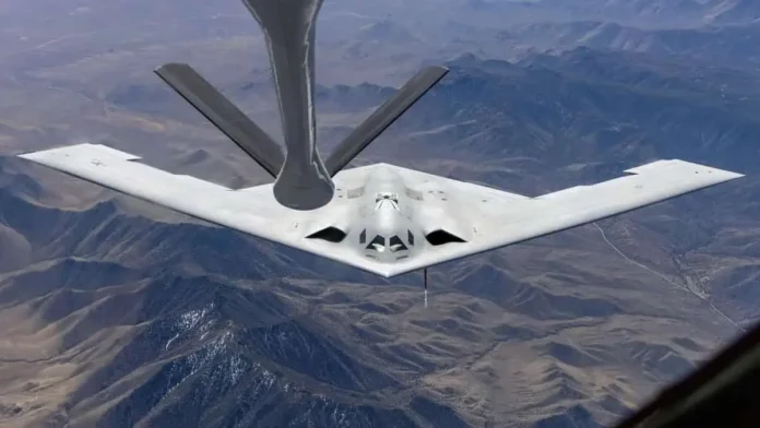 Дополнительно представлен кадр сбоку: B-21 в маневре сближения с заправщиком, демонстрируя шланг-дозатрав. Раккурс подчеркивает небольшую длину машины — сравнимую с F-15 Eagle. Размах крыльев эксперты оценивают приблизительно в 45 до 47 метров.